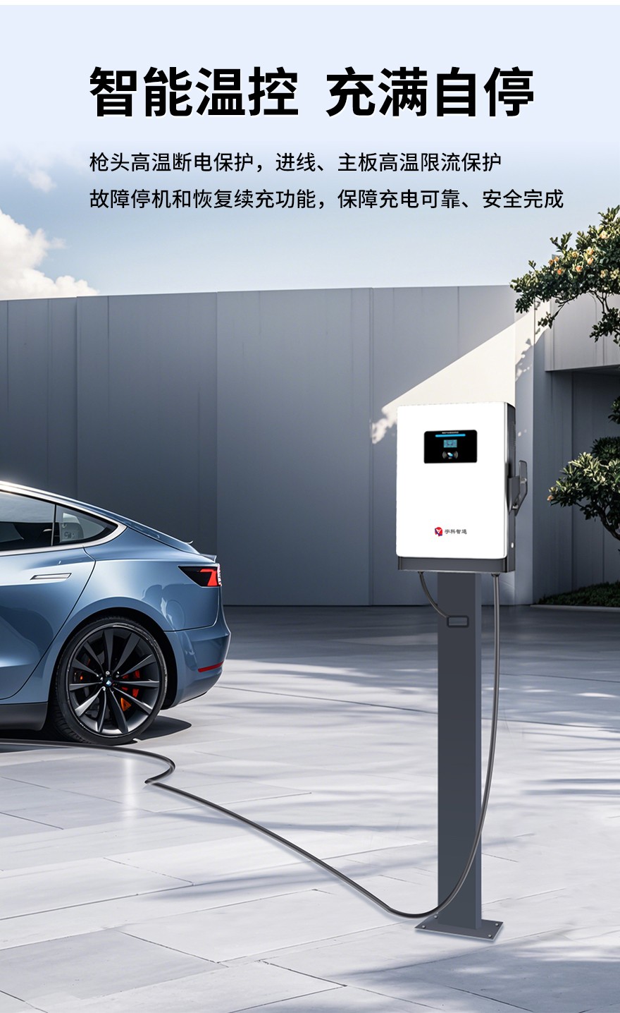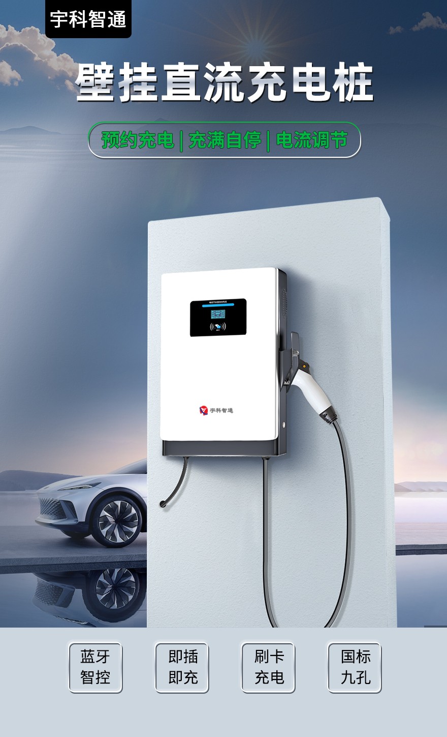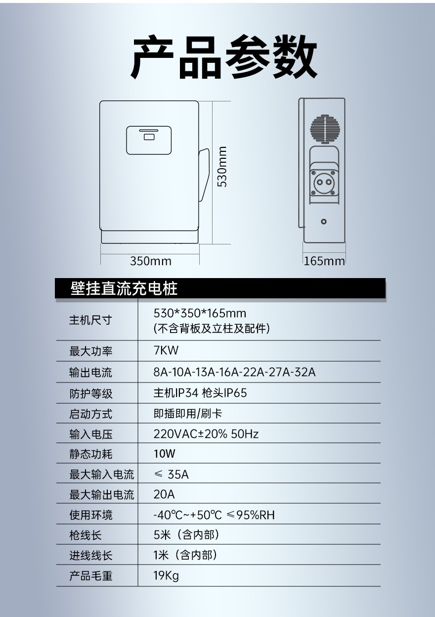 本產品通過立柱或壁掛方式安裝在室外或建筑物內,為電動汽車進行充電。